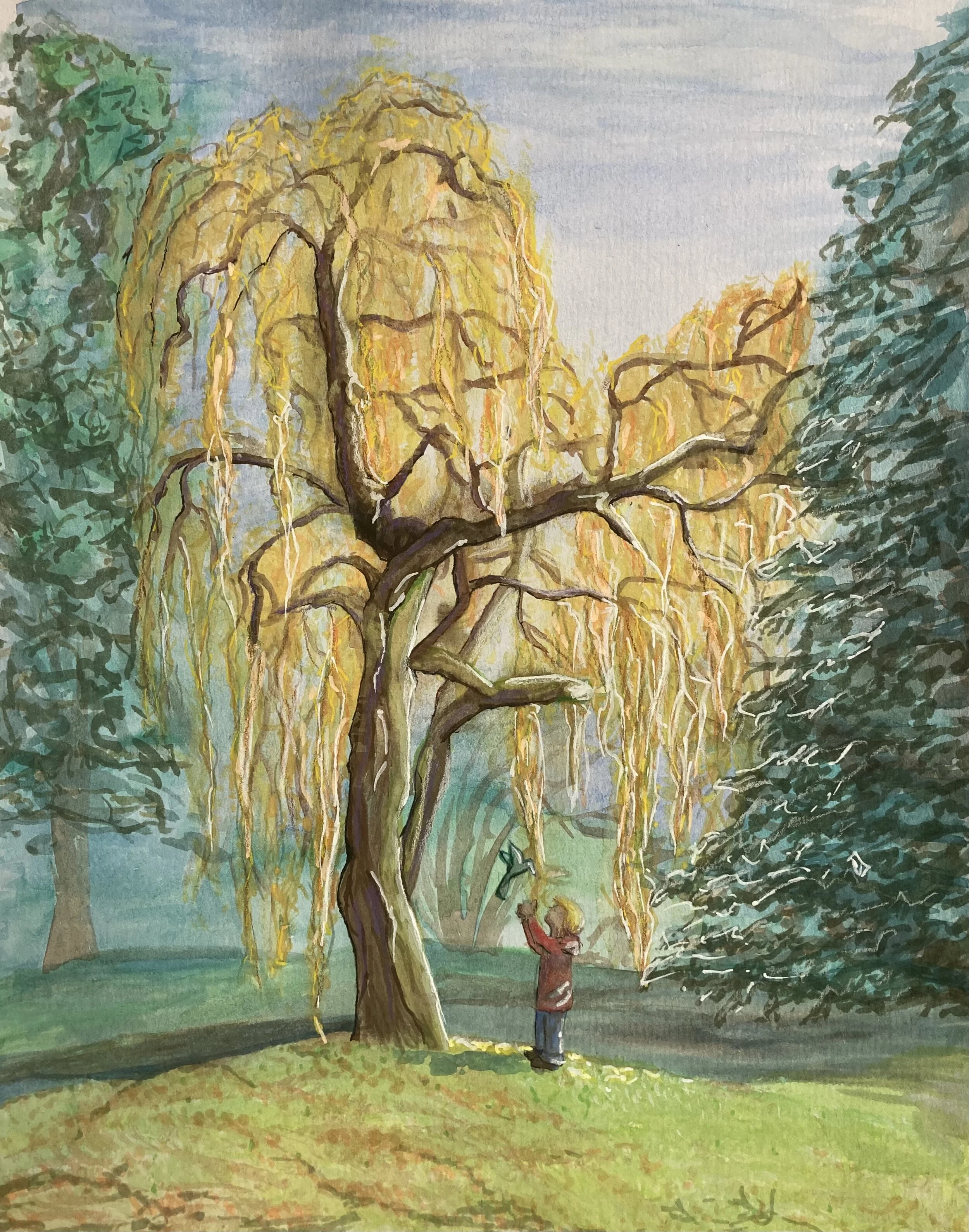 One Sunday morning the seed of this soft and heart warming painting was planted. Inspired by a stunning willow from a children’s park in the Pacific Northwest, a magical adventure about a boy and a bird began. Starting with water colors, then dabbling with a series of pens, inks, pencils, and paint, this beautiful moment sprung to life to spread joy in the world.